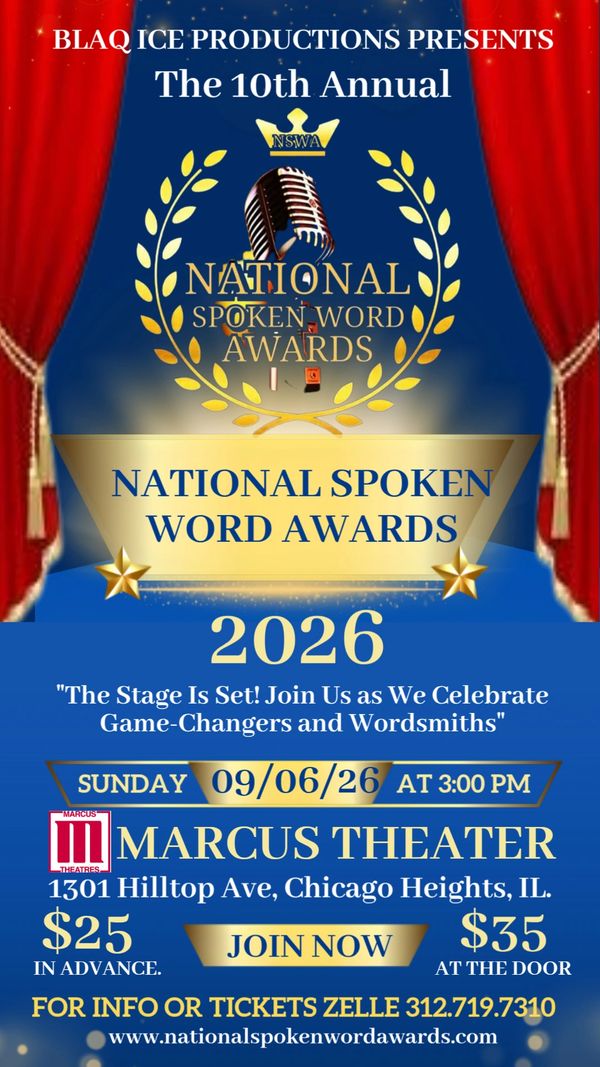 The National Spoken Word Awards was founded in 2017 by De'Andre Hawthorne aka Blaq Ice, an international award winning Spoken Word Poet from Chicago and the father of the Chicago Poet Laureate. He was instrumental in bringing the National Poetry Awards to Chicago in 2016, the 7th and final year of the National Poetry Awards. The end of the National Poetry Awards inspired the beginning of the NATIONAL SPOKEN WORD AWARDS.